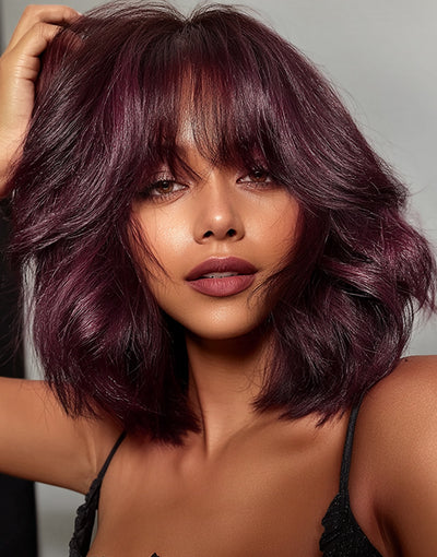 10" 12" 14" 99J Brown Black Color Layer Cut Straight Bob Wig With Bangs Glueless Wigs Flash Deal