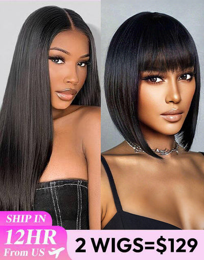 2 WIGS=$129|18" Straight 13x5 Lace Wig+14" With Bangs Bob Straight Wig Flash Deal