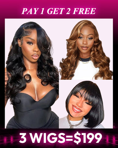 3 WIGS=$199|14" TP4/27 Wavy 13x4 Lace Wig+14" Body Wave 6x5 Lace Wig+14" Bob Straight Layer 4x4 Lace Wig With Bangs Flash Deal