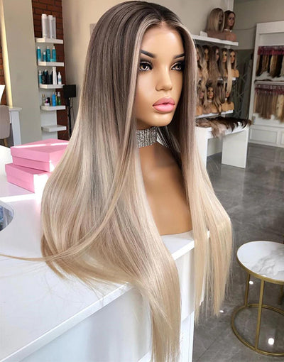24" 28" Ombre Ash Blonde Highlight Dark Roots Straight 13x4 Lace Wig Flash Deal